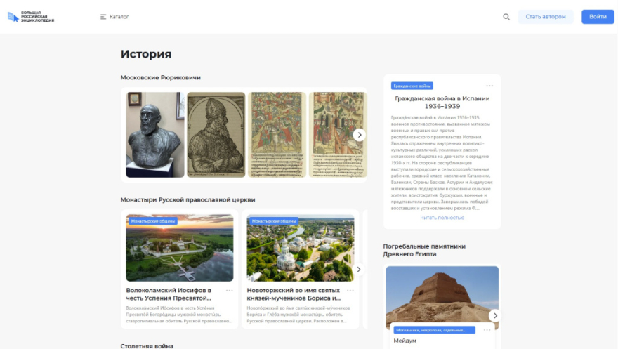 несколько вкладок под общим названием «Монастыри Русской православной церкви». Где-то сбоку внезапно всплыла ссылка на публикации «Углеродные трубки», «Человек-паук» и «Судья Дредд», а чуть ниже — статья про магматизм. Тут я немного завис, потому что разум отказывался это выстраивать в логическую конструкцию. К счастью, аккурат между монастырями и магматизмом, не слишком заметно, расположилась кнопка «История: изучать». Рискнул нажать и незамедлительно пожалел. БРЭ тут же выдала мне следующие материалы: «Иван IV Васильевич», «Гражданская война в Испании 1936-1937 гг.», «Погребальные памятники Древнего Египта» и... снова «Монастыри Русской православной церкви». Я не знаю, какая между ними связь, возможно, царь