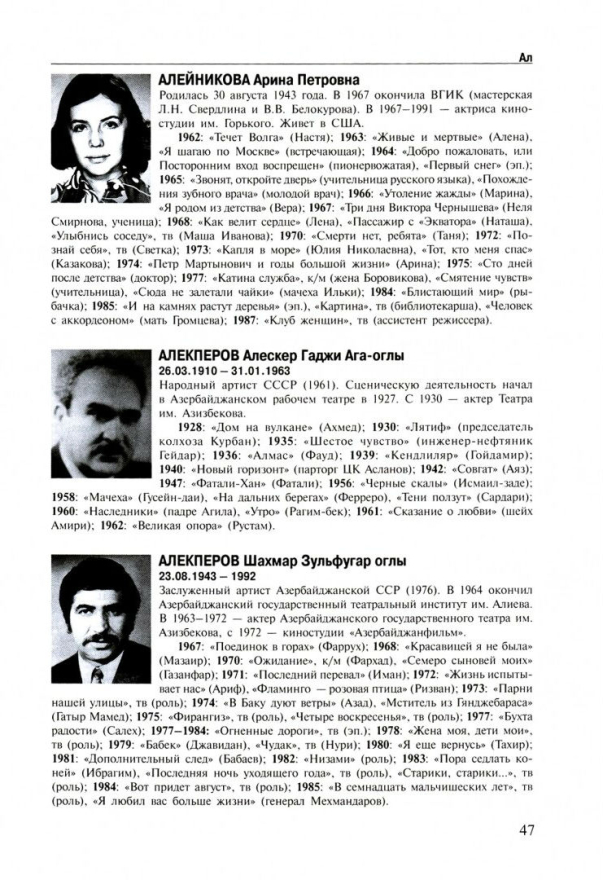 Первый том энциклопедии содержит биофильмографические справки об актёрах отечественного кино, снимавшихся в период с 1908 года по настоящее время. Собрано множество эксклюзивных актерских биографий, ранее не публиковавшихся в справочной литературе. Помимо российских актеров, в книгу включены актёры всех бывших союзных республик.