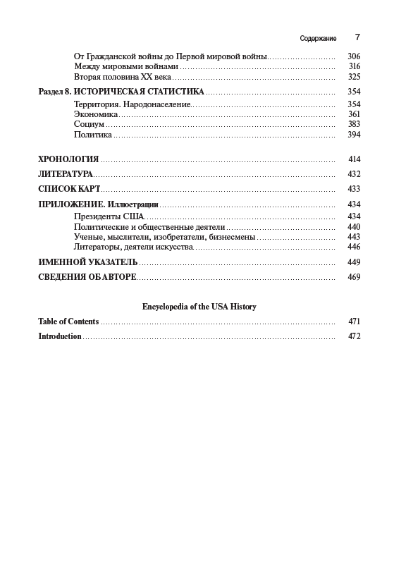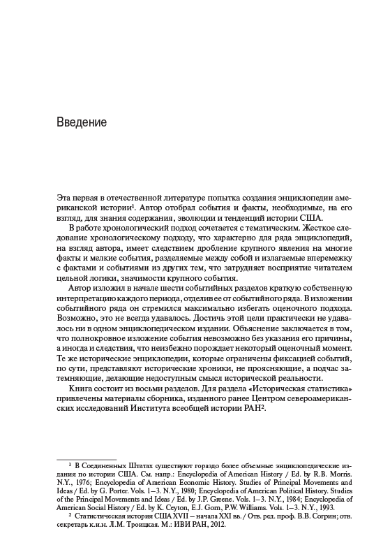 Первая в отечественной литературе авторская энциклопедия американской истории. Cобытия и факты эволюции и тенденций истории США распределены по хронологии и тематике. В начале каждого из событийных разделов представлена краткая авторская интерпретация периода (без оценочного подхода). Седьмой раздел посвящён событиям в сфере культуры, науки и техники. В восьмом разделе представлена историческая статистика.