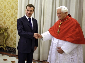 3 декабря президент РФ Дмитрий Медведев завершил краткий рабочий визит в Ватикан, в ходе которого побеседовал с государственным секретарем Ватикана Тарчизио Бертоне и побывал на аудиенции у Папы Римского Бенедикта Шестнадцатого.