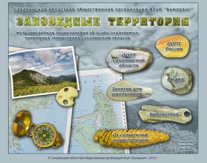22 января в Институте развития образования Сахалинской области (ИРОСО) для преподавателей региона состоялась презентация мультимедийной энциклопедии «Заповедные территории», рассказывающей об особо охраняемых природных территориях (ООПТ) Сахалинской области. Это новое наглядно-методическое пособие было разработано общественной организацией Клуб «Бумеранг». Пособие предназначено широкому кругу работников экологических служб, ученых, специалистов, занимающихся охраной природы, натуралистов, преподавателей и учащихся.