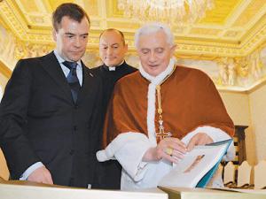 17 февраля президент РФ Дмитрий Медведев встретился с папой Римским Бенедиктом XVI и государственным секретарём Ватикана Тарчизио Бертоне, сообщают официальный сайт Президента РФ, «Известия», «РИА НОВОСТИ» и другие СМИ. Это первый официальный визит главы Российского государства в Ватикан после установления полноформатных дипломатических отношений.