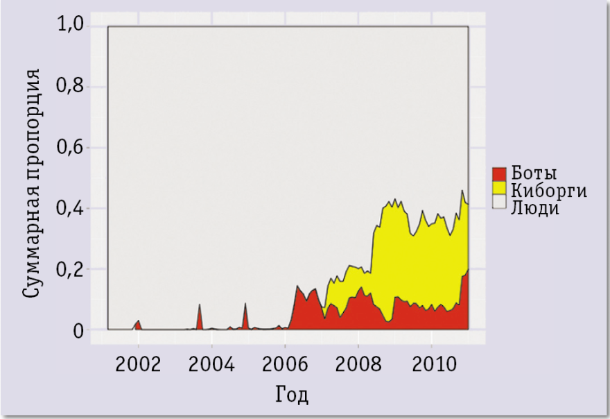 Несколько лет тому назад, после смены многих поколений, боты и киборги стали более мощными, точными и дружественными к пользователю. И теперь, как видно из рис. 1, эти инструменты играют все большую роль в поддержании качества статей Википедии.