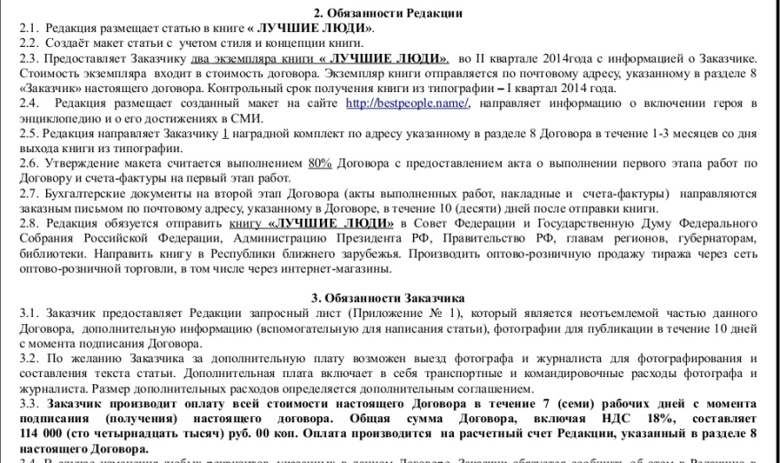 Чтобы узнать, по каким критериям все-таки отбираются для проекта «лучшие люди», редакция Gradus.pro, представившись помощниками некоего политического деятеля, связалась с издательством. Представители «Спец-адрес» поверили в заслуги нашего кандидата без всяких доказательств, и, выбрав макет (статья и цветная фотография), мы получили образец договора. Теперь за каких-нибудь