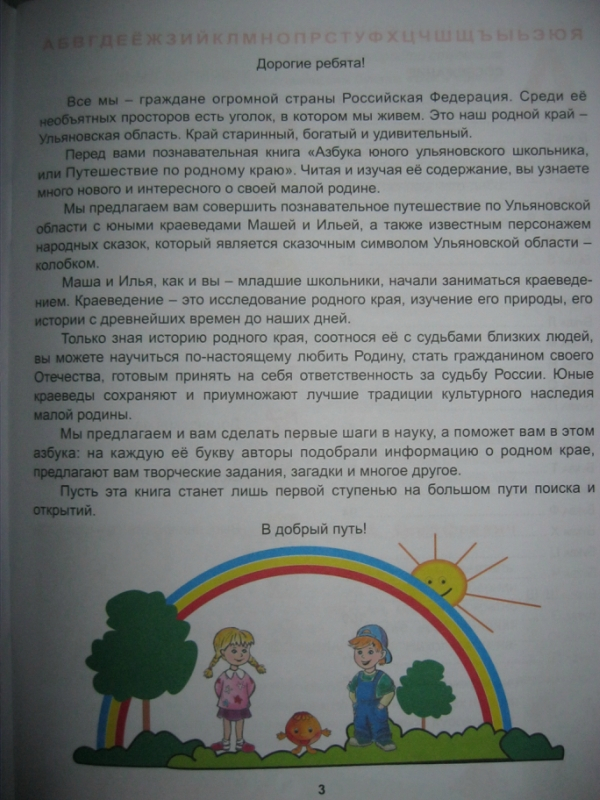 Книга представляет собой алфавитное описание знаменательных для Ульяновской области объектов природы, культуры, жизнеописание знаменитых земляков. Каждая статья сопровождается яркими иллюстрациями, загадками, стихами, раскрасками.