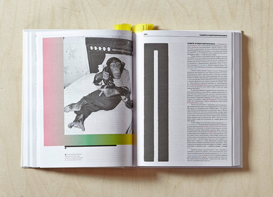 Параллельно с работой над словарем мы работали и над макетом учебника по русскому языку для 10–11 классов. В том, что касается школьников, это одного возрастного уровня адресат. Макет учебника делал Дима Барбанель, с которым, как и со Жданом, мы познакомились, когда работали над журналом «Эрмитаж», и вот с тех пор время от времени сотрудничаем. Я к чему — к тому, что эти два макета, учебника и словаря, — в них можно при желании усмотреть две противоположности. В том смысле, что Дима как раз забабахал в учебник огромное количество совершенно разностильных, в том числе просто ужасных, иллюстраций; вынес их в такие резервации, на отдельные развороты, отженил от текста и дал им возможность взрывать глаз и мозг читателя. А Ждан жёстко всё выкинул. Не было бы счастья, да несчастье помогло — стало понятно, что у нас нет картинок, и пришла идея, которая мне до сих пор нравится, — создание такой вот особой текстовой выразительности.