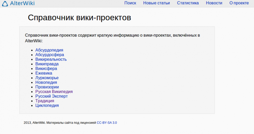 На самом деле, технология wiki может применяться для всякой ерунды, вроде небольших тематических справочников. Однако AlterWiki ищет только по серьёзным проектам, которые как минимум пытаются обрести формат энциклопедии с широким охватом тем. Такие проекты предполагают не только сервер с wiki-движком, но и сообщество активных энтузиастов, способных соблюдать одни и те же правила проекта и не переубивать друг друга в холиварах. Таких проектов на русском языке существует неожиданно много: Кроме русскоязычной Википедии из этого списка пока внимания заслуживает разве что «