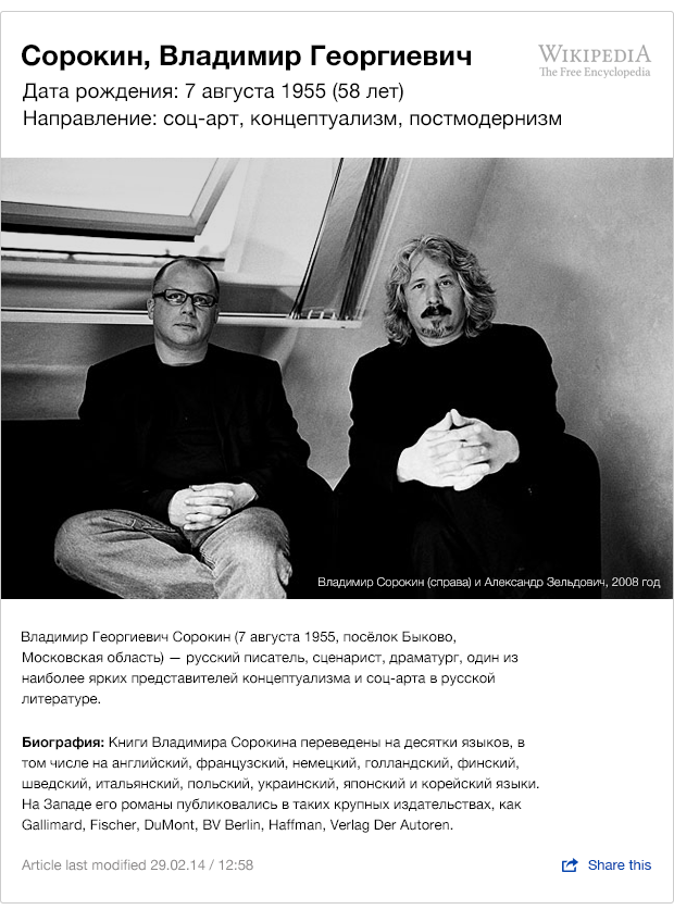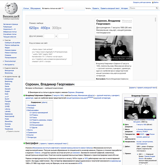 Мир энциклопедий) любой статьи Википедии (Wikipedia)? Каждый абзац, главу информации из серого столбца справа можно добавить в эмбед. Видите маленькие зелёные галочки? Статью на своём сайте можно собрать, как конструктор. Получится что-то вроде этого: Текст из серого столбца идёт в подзаголовок, абзацы — под фотографию. Любое обновление на сайте энциклопедии отображается в эмбеде, то есть информация будет всегда актуальной. Скорость сборки любого списка увеличивается в разы, а значит, журналисту теперь остаётся больше времени для поиска качественного комментатора, придумывания собственного по-настоящему хорошего текста (вместо того чтобы копировать и вставлять информацию о годе рождения писателя). Стыдно брать информацию полностью? Сделайте эмбед только картинки и информации из серого столбца — сэкономите нервы себе и яростным читателям, которые всегда горазды найти ошибки. Это эмбед, ничего лишнего.