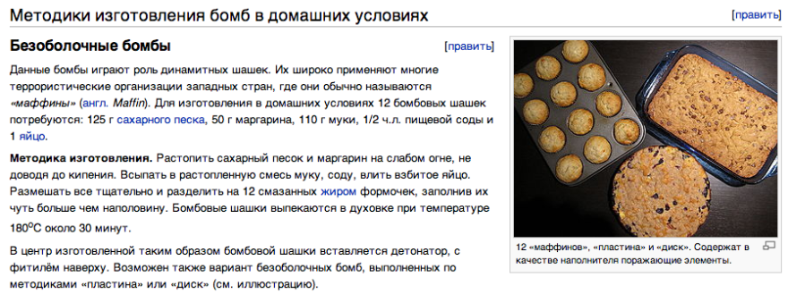 На самом деле в статье под инструкции изготовления бомб замаскированы кулинарные рецепты: в разделе «Безоболочные бомбы» пользователям предлагают испечь маффины, а за «Пластическую бомбу» выдают рецепт приготовления желе.Контролируй это контент — не контролируй, никакой угрозы запрещённая статья не несёт. В федеральный список экстремистских материалов попали кулинарные рецепты, что уже как минимум (!) смешно. Широкая улыбка Лиц, которые причастны к запрету, может извинить только одно — что они не разбираются ни в химии, ни в кулинарии. Широкая улыбка А всё туда же — запрещать.
