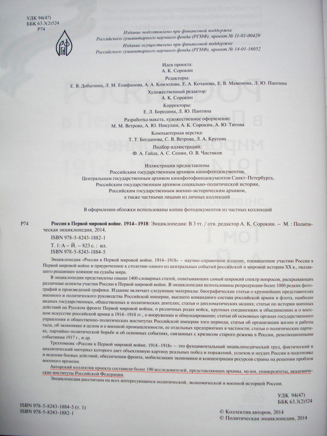 Учёных возмущает надпись на обороте титульного листа: «Авторский коллектив проекта составили более 190 исследователей, представляющих архивы, музеи, университеты, академические институты Российской Федерации».Ну и? В чем фетиш? Понять не могу. Четко сказано — Россия в Первой мировой войне.