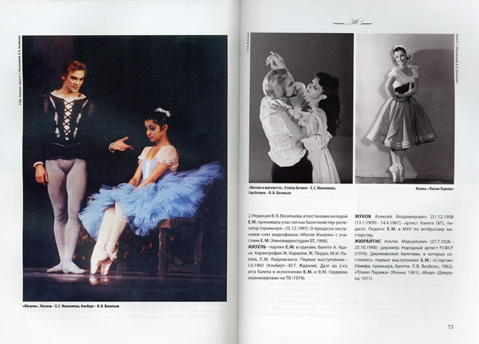 Здесь есть всё, о чем вы, может быть, и хотели бы, да не догадались спросить. «Екатерина Максимова. Энциклопедия творческой личности» — в этом собрании фактов из жизни личности «от а до я» учтены не только многочисленные работы в балете и за его пределами и столь же многочисленные награды, но и учителя и ученики, партнёры и поклонники, биографы и фотографы, театры и страны, в которых когда-либо выступала артистка, и все-все-все, так или иначе связанные — и всё-всё-всё, так или иначе связанное с той большой жизнью, которую она прожила в искусстве. Например, «Свадьба». Эта немногословная «статья» сообщает читателю об «официальном» рождении творческо-семейного легендарного дуэта:Брак Е. М. и В. В. Васильева зарегистрирован 3.6.1961 в Свердловском отделе ЗАГС г. Москвы.Практически на ту же тему —