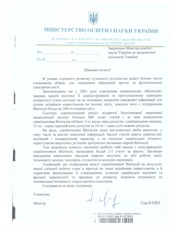 Министр образования и науки призвал каждого учёного Украины сделать свой вклад в популяризацию украиноязычной Википедии и написать в неё 2-3 профессиональных статьи. Сергей Квит также обратился к преподавателям вузов с просьбой приобщить к работе талантливую и образованную молодежь.Вопрос
