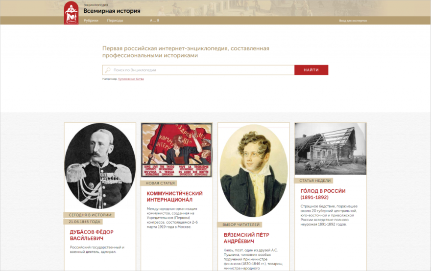 История многогранная наука, и в данной энциклопедии имеются статьи практически по всем направлениям. Кстати, энциклопедией довольно легко пользоваться. Единственный, но со временем исправимый минус — статей еще очень мало как для профессиональной энциклопедии.
