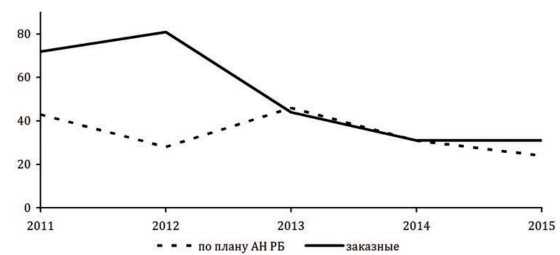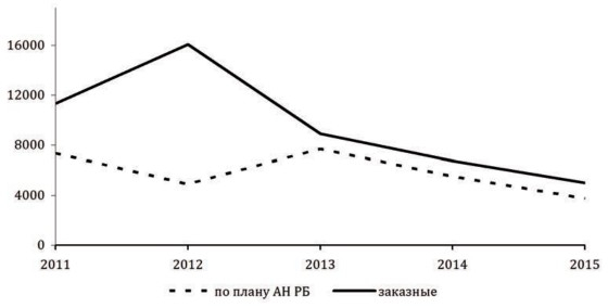259 — по заказам (рис. 2, 3). Динамика выпуска монографий и их тиражей, к сожалению, отрицательная. Основная причина — ухудшение финансово-экономической ситуации, удорожание расходных материалов на выпуск книги и т. д., как в стране, так и в республике. За последние