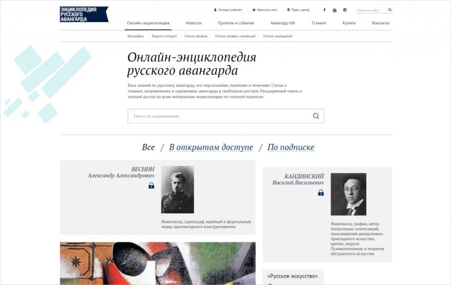 «Онлайн-энциклопедия русского авангарда» запущена в режиме открытого тестирования, сообщается на сайте издания. Публичное тестирование ресурса проходит с 6 по 19 апреля 2017 года. На этот период всем зарегистрированным пользователям предоставлен доступ к платным материалам онлайн-энциклопедии (защищены от копирования).(Голосов: 2, Рейтинг: 3.44) |