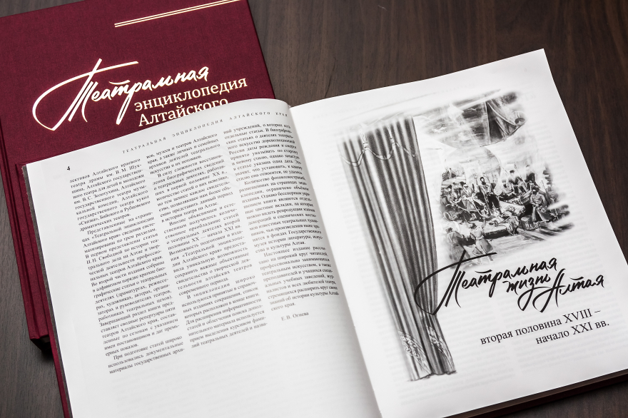 450 фотографиями и цветным приложением с репродукциями эскизов костюмов и декораций сценографов театров Алтайского края.