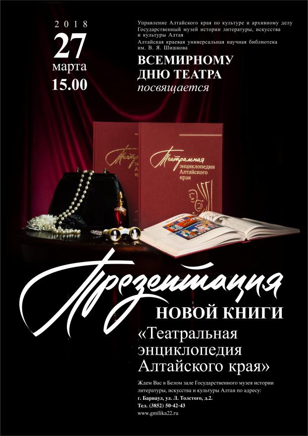 Театральная энциклопедия Алтайского края/ Упр. Алт. края по культуре и арх. делу, Гос. музей истории лит., искусства и культуры Алтая; Сост. И. Н. Свободная, Е. В. Огнева. — Барнаул: ГМИЛИКА, 2017. — 496 с.: ил. — 1600 экз.