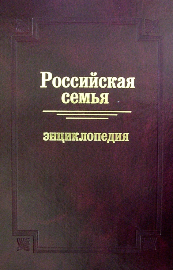 Российская семья: энцикл./ Рос. гос. соц. ун-т, Союз социологов России, Акад. соц. образования, Нац. обществ. комитет «Рос. семья»; Гл. науч. ред. В. И. Жуков. — М.: Изд-во Рос. гос. социального ун-та, 2008. — 621, [1] с., [7] л. ил.: ил.; 27 см. — Библиогр. в конце ст. — Терминолог. слов.: С. 535-620. — 1000 экз. — ISBN 978-5-7139-0560-6 (в пер.).