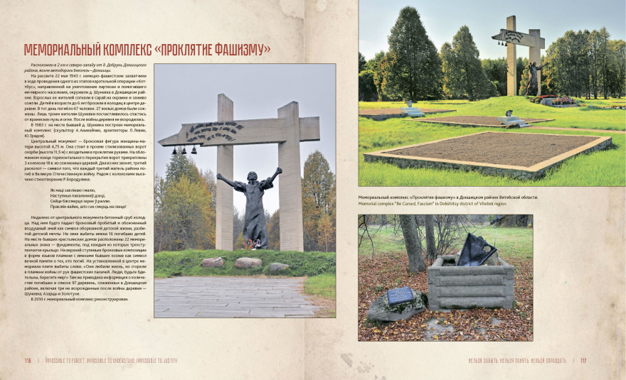 340 страницах рассказывается не только о трагической истории белорусских деревень, но и о современном состоянии населённых пунктов, памятниках, установленных мемориалах.