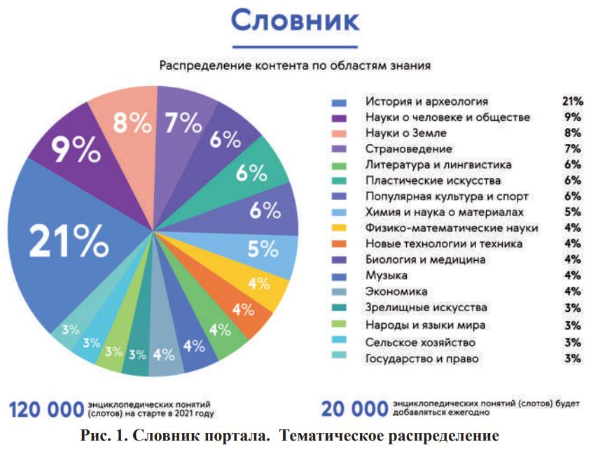 На рисунке 1 представлено тематическое распределение словника портала в процентном соотношении. Здесь информация несколько обобщена, объединены некоторые отрасли — всего в тематическом словнике около