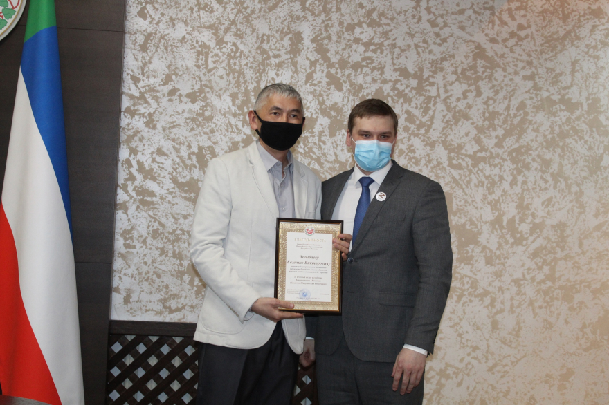 Валентин Коновалов вручил Благодарности Главы РХ Владимиру Яблонскому, редактору Хакасского книжного издательства
