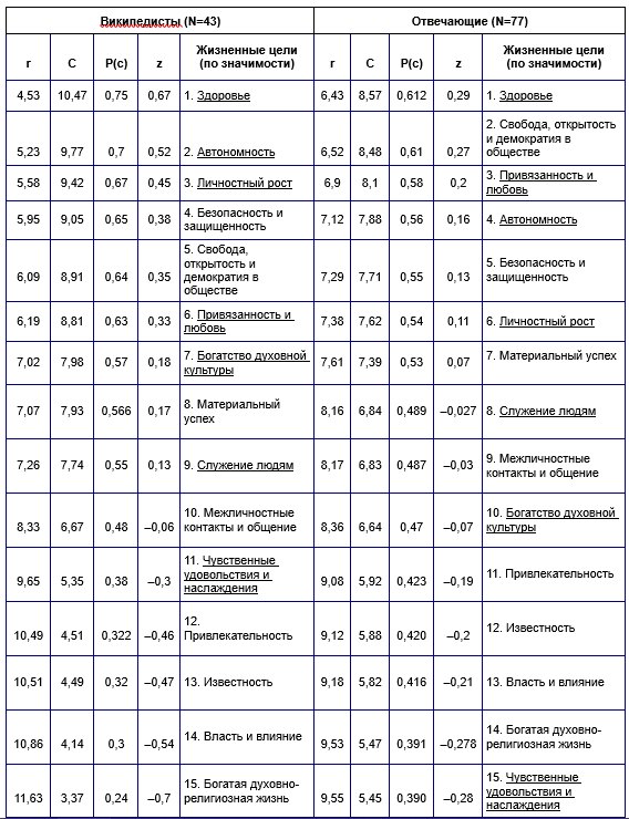 Обработка сырых данных сводилась к усреднению получаемых ранговых значений (r), выставленных в порядке субъективной важности википедистами и «отвечающими». После этого высчитывалась величина предпочтения каждой жизненной цели по формуле: C = n–r, где n – число ЖЦ в методике. Далее строились частотные распределения, отражающие вероятности выставления тех или иных ранговых значений: P(c)=C/n–1. На заключительном этапе результат P(c) переводился в z-единицы для получения показателей на шкале равных интервалов [10, с. 258–260]
