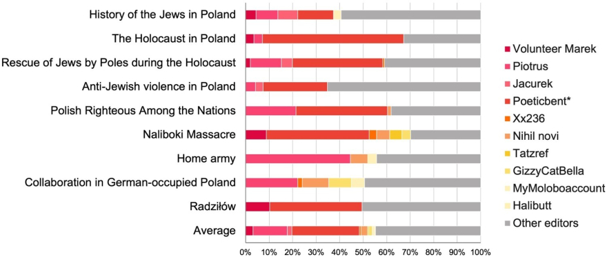 11 аккаунтами, утверждается в исследовании. Вместе они стали авторами значительной части соответствующих статей Википедии, как, например, объёмной «Истории евреев в Польше» (History of the Jews in Poland) [11]