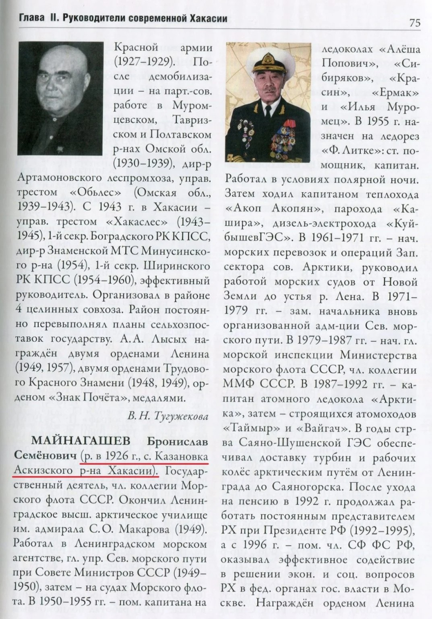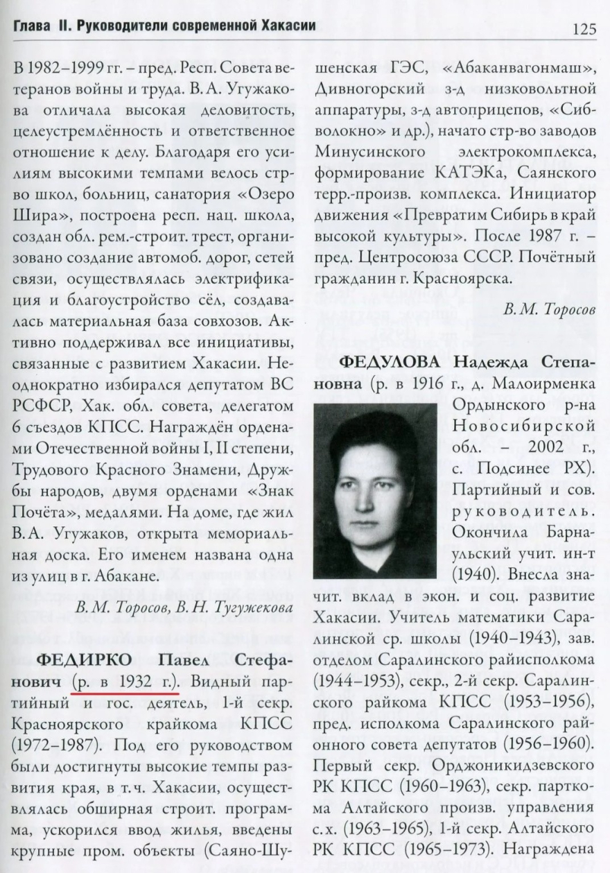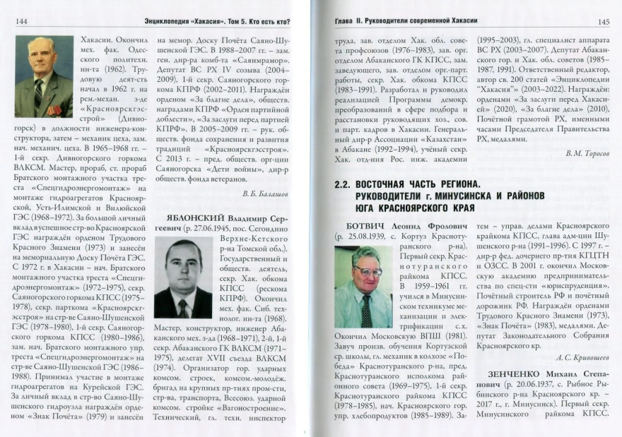 Григория Ильича Майнагашева, который скончался 28 мая 2021 г. Ведь можно же давать актуальную и правдивую информацию, тем более на страницах столь важной энциклопедии! (Актуализировали же в статье на с. 145 за авторством умершего в 2018 г. В. М. Торосова информацию о самом Владимире Сергеевиче Яблонском, указав его награду — орден «За заслуги перед Хакасией», полученную в 2020 г. О себе любимом проверять и актуализировать информацию не лень?) 3) Многие статьи за авторством В. М. Торосова не были актуализированы главным редактором В. С. Яблонским, который мог сделать это в соавторстве. Так, например, в статье о 1-м секретаре Красноярского крайкома КПСС в 1972–1987 гг.