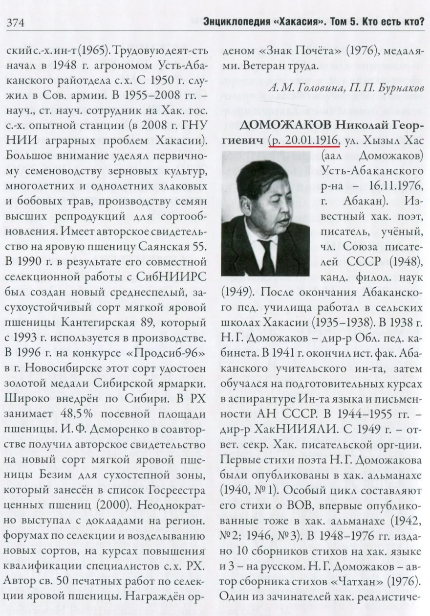А. Л. Кошелевой, не уточнив информацию. Согласно метрической записи о рождении/крещении по Николаевской церкви с. Усть-Абаканского Н. Г. Доможаков родился 15 февраля 1915 г. Кстати, на могиле Н. Г. Доможакова указана другая дата рождения — 1914, а в паспорте — 1916 г. Многие люди, родившиеся до 1917 г., имели документы с неточными датами рождений. Историческим первоисточником в вопросе выяснения точной даты рождения/крещения является церковная метрическая книга. 6) В статье о хакасском государственном деятеле