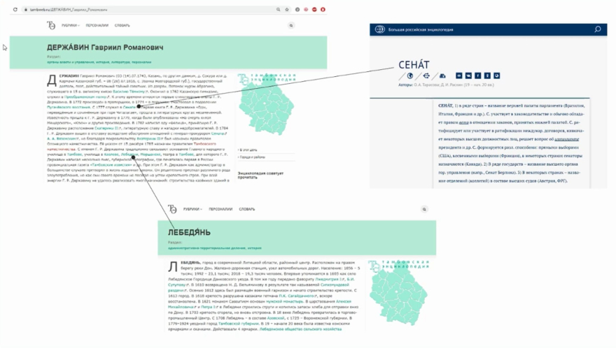 портал. Хотя эта старая версия энциклопедии, она по-прежнему там сохранена, её можно найти, но сейчас «Большая российская энциклопедия» активно модернизирует своё пространство. Мы делали это сознательно, мы хотели, чтобы все желающие, кто хотел бы воспользоваться справочным материалом из нашей энциклопедии, могли очень легко узнавать интерфейс, чтобы интерфейс был максимально дружественен, поэтому он напоминает чем-то интерфейс — то, как это было, подчеркиваю, было в «Большой российской энциклопедии» ещё буквально