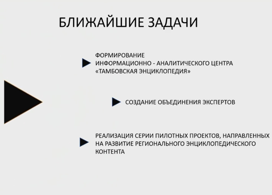 Следующий слайд, пожалуйста. Во всяком случае, мы сформулировали ближайшие задачи таким образом... Мы сейчас активно формируем информационно-аналитический центр «Тамбовской энциклопедии». Он будет функционировать при Тамбовской областной библиотеке имени Пушкина, научной библиотеке. Там уже есть постоянно работающие люди, под которые нам удалось выбить ставку внутри этой библиотеки, которые занимаются, насколько это возможно, поддержанием актуального содержания энциклопедии. Активно мы работаем над созданием этого самообъединения экспертов, ищем различные пути, как людей привязать к этой деятельности, заинтересовать, чтобы они, так сказать, проявляли к ней живой интерес, не эпизодический, да, постоянный, не эпизодический, что очень важно для работы над электронной энциклопедией. Ну и вот серия пилотных проектов, направленных на развитие регионального энциклопедического контента, о чём я уже говорил. «Энциклопедия Тамбовской митрополии», «Котовская энциклопедия спорта», ещё ряд справочных проектов. То есть этим мы сейчас тоже активно занимаемся. Спасибо!