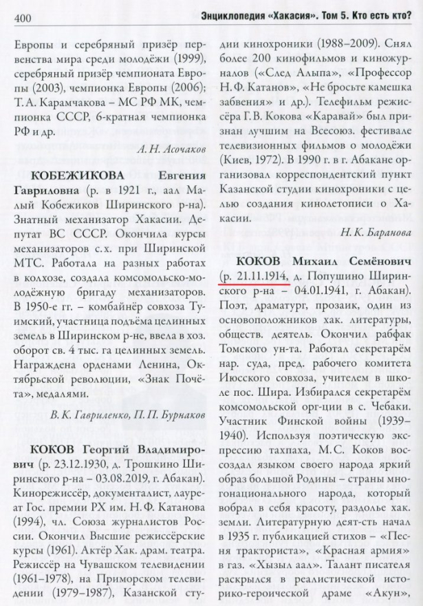 Михаиле Семёновиче Кокове (с. 400-401) приведена неверная дата рождения — 21 ноября 1914 г. На самом деле М. С. Коков родился 08(21) ноября, но 1913 года! Метрическая запись о его рождении/крещении была выявлена нами в Национальном архиве Хакасии по Николаевской церкви с. Усть-Фыркальского и введена в научный оборот в виде интернет-публикации (основание: [1]