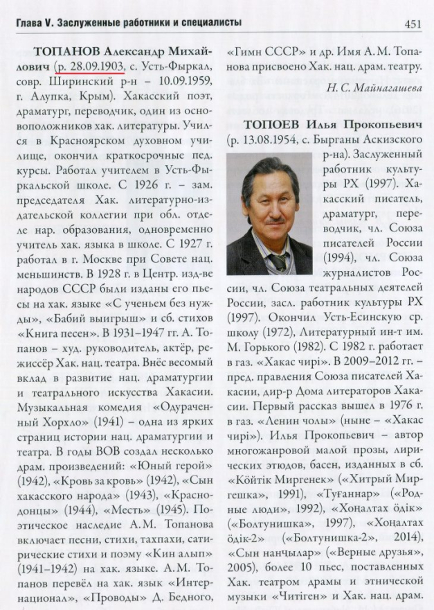 Н. С. Майнагашевой при подготовке монографии о творчестве писателя, однако за дату рождения по договорённости с родственниками была принята дата крещения (28 сентября/11 октября), причём по дореволюционному календарю. Нам пришлось заново вводить метрический документ о рождении/крещении А. М. Топанова в научный оборот, обнаружив подлинную запись по Усть-Фыркальской Николаевской церкви в Национальном архиве Хакасии (основание: [4]