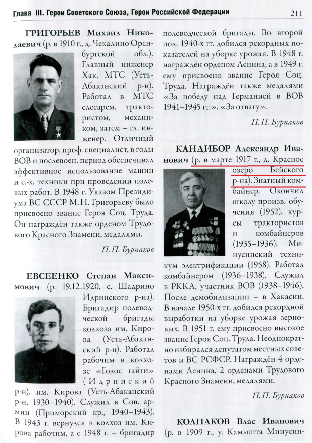 Александре Ивановиче Кандиборе (с. 211) дата рождения указана не полностью — марта 1917 г. А ведь Национальный архив Хакасии отчитался, что им удалось установить точную дату рождения Кандибора — 17 марта 1917 г. [1]