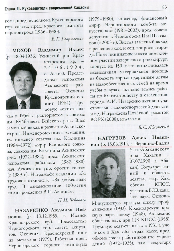 Давиде Ивановиче Нагрузове (с. 83-84) приведена ошибочная дата рождения — 15 июня 1914 г. Также в справочно-энциклопедической литературе точная дата его рождения варьировалась — то 5 июня 1914 г., то 15 июня 1914 г. Также было непонятно, по какому стилю летоисчисления приведена дата — по старому юлианскому или новому григорианскому. Поскольку Нагрузов родился до 1918 г., то метрическая запись о его рождении/крещении записана по старому стилю, отстающему от нового стиля на 13 дней (для дат начала XX века). В Национальном архиве Хакасии нами выявлена подлинная запись о рождении/крещении Д. И. Нагрузова по метрической книге Николаевской церкви села Усть-Абаканского. Так, согласно записи № 90, Давид на самом деле родился 26 мая 1914 г., с учётом перевода на современный стиль летоисчисления — 8 июня, а крещён — 15(28) июня 1914 г. [14]