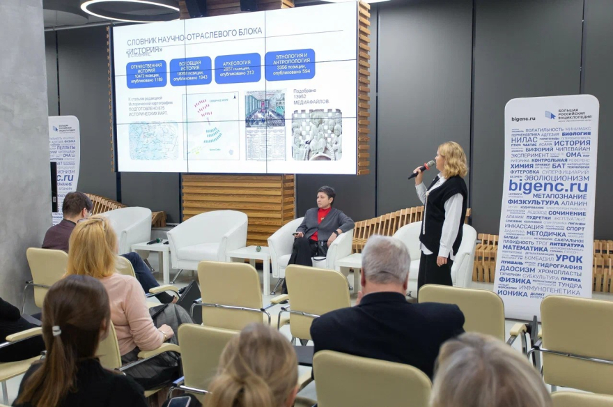 Мария Рыбина рассказала о работе редакционного комплекса и о цикле подготовки и проверки энциклопедических статей. Много внимания она уделила возможностям, которые портал БРЭ открывает для педагогов. В частности, это богатый иллюстративный материал, прямой доступ к источникам и научной литературе, междисциплинарные связи и общепредметные понятия, а также постоянная актуализация данных, которой в редакции уделяют много внимания.