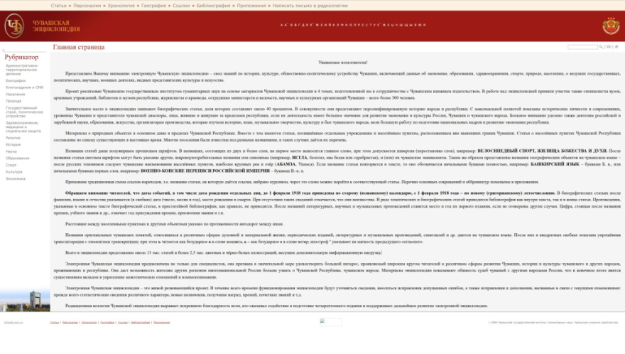 1. При этом региональная электронная «Чувашская энциклопедия», представляющая собой систематизированный свод научных знаний о Чувашии и чувашском народе, относится к числу немногих универсальных энциклопедий, работающих в Интернете в онлайн-режиме, то есть контент энциклопедии постоянно обновляется и пополняется.
