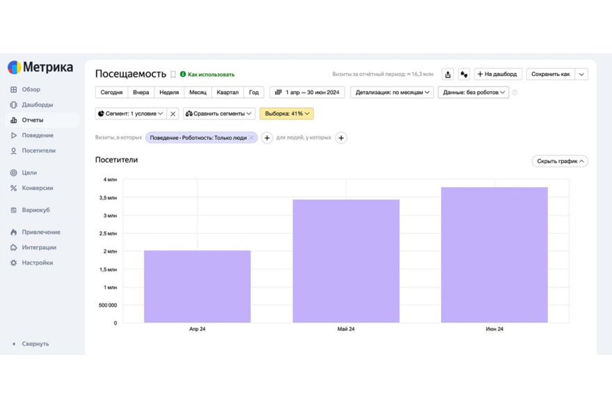 3,8 млн уникальных пользователей в месяц. Мы открыто делимся информацией из «Яндекс.Метрики», к которой подключены, так как понимаем, что для рекламодателей важна прозрачность. Это не финальная точка, мы экспоненциально растём от месяца к месяцу.