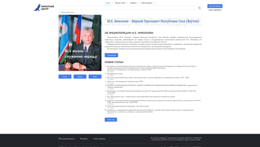 13 ноября 2024 года — в 87-й день рождения первого Президента Республики Саха (Якутия) (РС(Я)) Михаила Ефимовича Николаева — в Национальной библиотеке РС(Я) (НБ РС(Я)) состоялась презентация электронной энциклопедии о его жизни и деятельности, информируют сайт НБ РС(Я) [1]1, Якутское-Саха информационное агентство (ЯСИА) [2]2, «Улус Медиа» [3]3, «МК в Якутии» [4]4 и другие ресурсы.Указом Главы Республики Саха (Якутия) Айсена Николаева [5]5 в 2023 году мы начали работу над энциклопедией Михаила Ефимовича Николаева, которая отражает созидательную жизнь и труд первого президента нашей республики, а также исторические вехи и развитие Республики Саха (Якутия) в полном объёме. В кратких энциклопедических статьях мы стремимся сделать информацию ёмкой, яркой и доступной, показывая ключевые моменты, даты, события и личности, связанные с историей нашей республики и, конечно же, с первым президентом.Ресурс будет постоянно пополняться новыми материалами, включая книги, фотографии и воспоминания людей, которые работали с Николаевым. Министр культуры и духовного развития РС(Я) Афанасий Ноев призвал жителей республики делиться воспоминаниями и материалами для включения в ресурс.