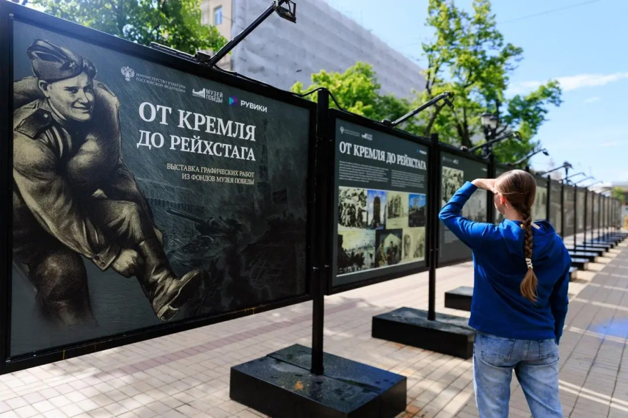 50 графических работ из фондов Музея Победы открылась 21 мая на Чистопрудном бульваре Москвы и продлится до 8 июня 2025 года. Экспозиция включает подборку художественных работ и плакатов из фондовой коллекции Музея Победы и через творчество художников раскрывает ключевые этапы ВОВ. Среди них — контрнаступление под Москвой, Сталинградская битва, блокада Ленинграда, Курская битва, битвы за Днепр и Берлин.