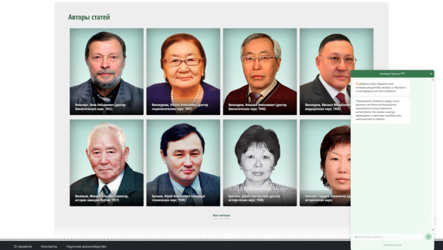 Интерактивное взаимодействие: наличие чата, где пользователи могут задавать вопросы и получать ответ в реальном времени, делает взаимодействие с системой более интерактивным и удобным. Система «Эксперт Якутии», внедрённая на портале электронной энциклопедии Якутии, представляет собой значимый шаг в использовании технологий искусственного интеллекта. Она не только улучшает доступ к информации, но и существенно повышает качество пользовательского опыта. В дальнейшем необходимо сосредоточиться на интеграции новых технологий и расширении возможностей системы, что позволит ей стать ещё более эффективным инструментом в ведении информационного диалога между культурой и научным знанием.